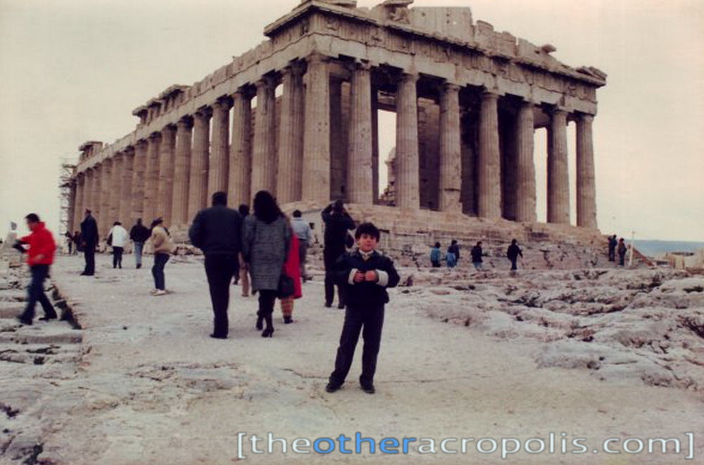 Ίσως η κλασικότερη γωνία λήψης του μνημείου από αρχής φωτογραφικής τέχνης. Κατακτητές, περιηγητές, διάσημοι και άσημοι, αλλοδαποί τουρίστες, επαρχιώτες και Αθηναίοι, σχολικές εκδρομές στάθηκαν σε αυτό περίπου το σημείο και φωτογραφήθηκαν. Απαθανάτισαν τον εαυτό τους με φόντο τον Παρθενώνα σαν ενθύμιο ή σαν τεκμήριο της επίσκεψης τους στην Αθήνα και όλα αυτά κάτω από ένα αβάσταχτο Αττικό ουρανό, απέραντα γαλάζιο και απέραντα μοναχικό όπως θα έλεγε και ο Χατζιδάκις! Το πιο ζωντανό κομμάτι αυτού του χώρου είναι χωρίς αμφιβολία οι επισκέπτες του. Εδώ, στα μέσα της δεκαετίας του 80΄, φωτογραφίζομαι φορώντας το μπουφάν του Κιτ, αξίζει να προσθέσω ότι στο στήθος υπήρχαν κόκκινα λαμπάκια που δυστυχώς δεν φαίνονται στη φωτογραφία.